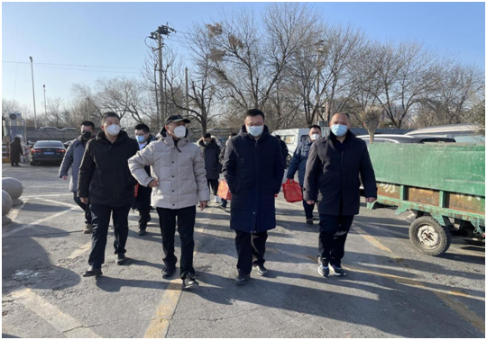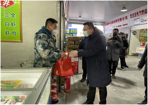 2023年 1月16日下午,区委常委、副区长崔旭龙到岳各庄市场调研并慰问重点保供商户,向他们发放慰问品,并代表区委区政府向他们致以节日的问候和新春的祝福。区商务局副局长张会利,青塔街道副主任张志强,岳各庄村党总支书记、市场总经理孙彪陪同参加。