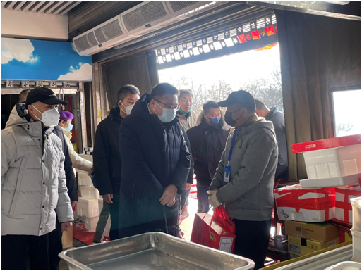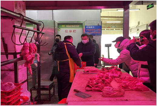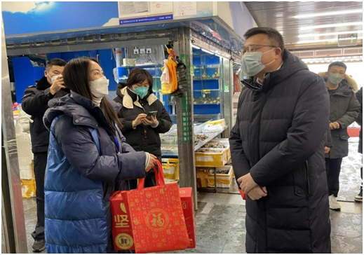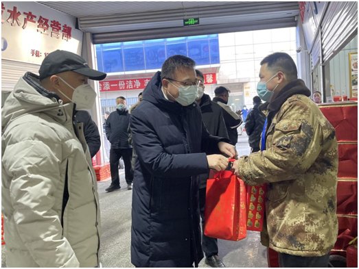 崔旭龙副区长详细询问了海鲜厅、猪肉厅、冻品厅部分商户的身体情况和经营现状,对他们在生活必需品保供方面做出的贡献表示肯定,并祝愿他们在新的一年身体健康,经营红红火火,兔年大吉大利。