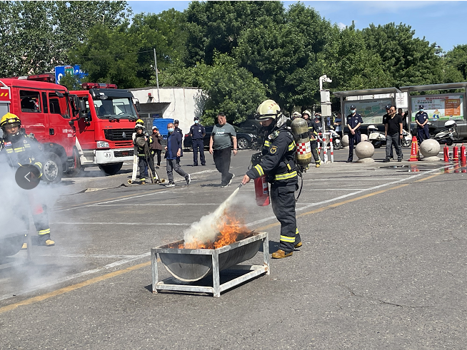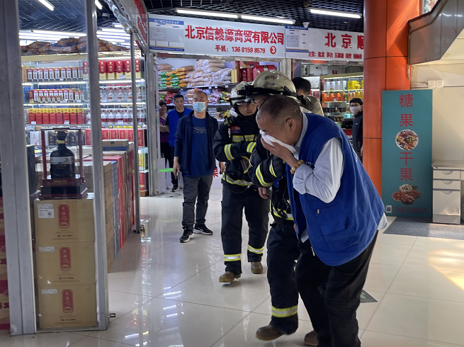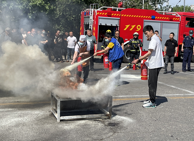 随后,孙彪书记的一声令下,演习正式有序开始,疏散引导小组、灭火行动组、抢救救援组三个组积极配合,在整个演练过程中,各守其岗、各负其责,有序地组织员工、顾客迅速疏散,用湿毛巾捂住口鼻,弯腰前行,不推挤,秩序井然,以最快速度到达指定疏散点;模拟现场发生火灾,参演队伍迅速整装集结,架设水泵和水带,对销售大厅的火情扑灭并清理火场;同时岳各庄村消防员现场讲解了常见灭火器性能、灭火基本原理及消防器材使用方法等各类消防安全知识,并对人员逃生及消防器材的正确使用进行讲解后,消防员及商户亲自示范左手握住软管、右手提着压把,有条不紊地手持灭火器体验灭火。